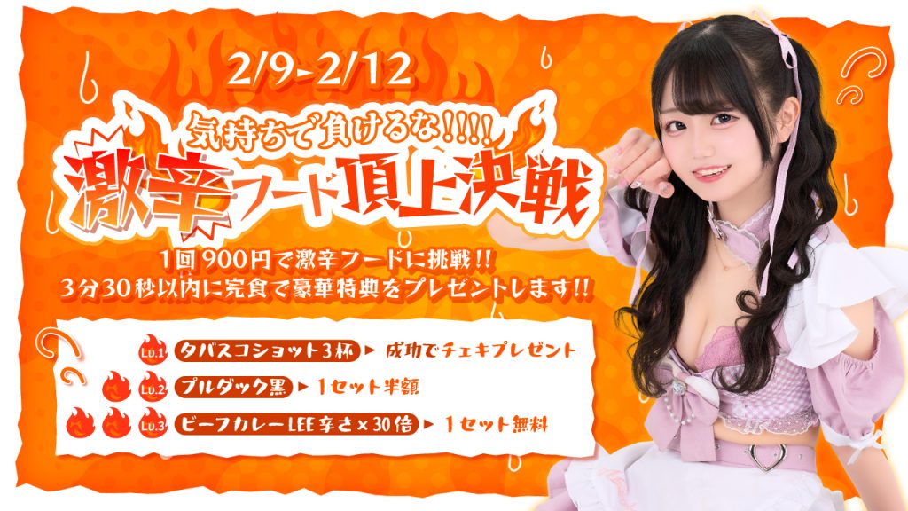 1回900円で激辛フードに挑戦!3分30秒以内に完食で豪華特典をプレゼントします🎁