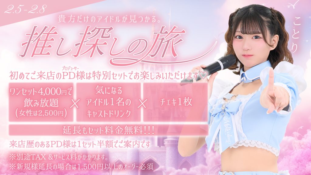 ワンセット4,000円で飲み放題(女性は2,500円)&気になるアイドル1名のキャストドリンク&チェキ1枚